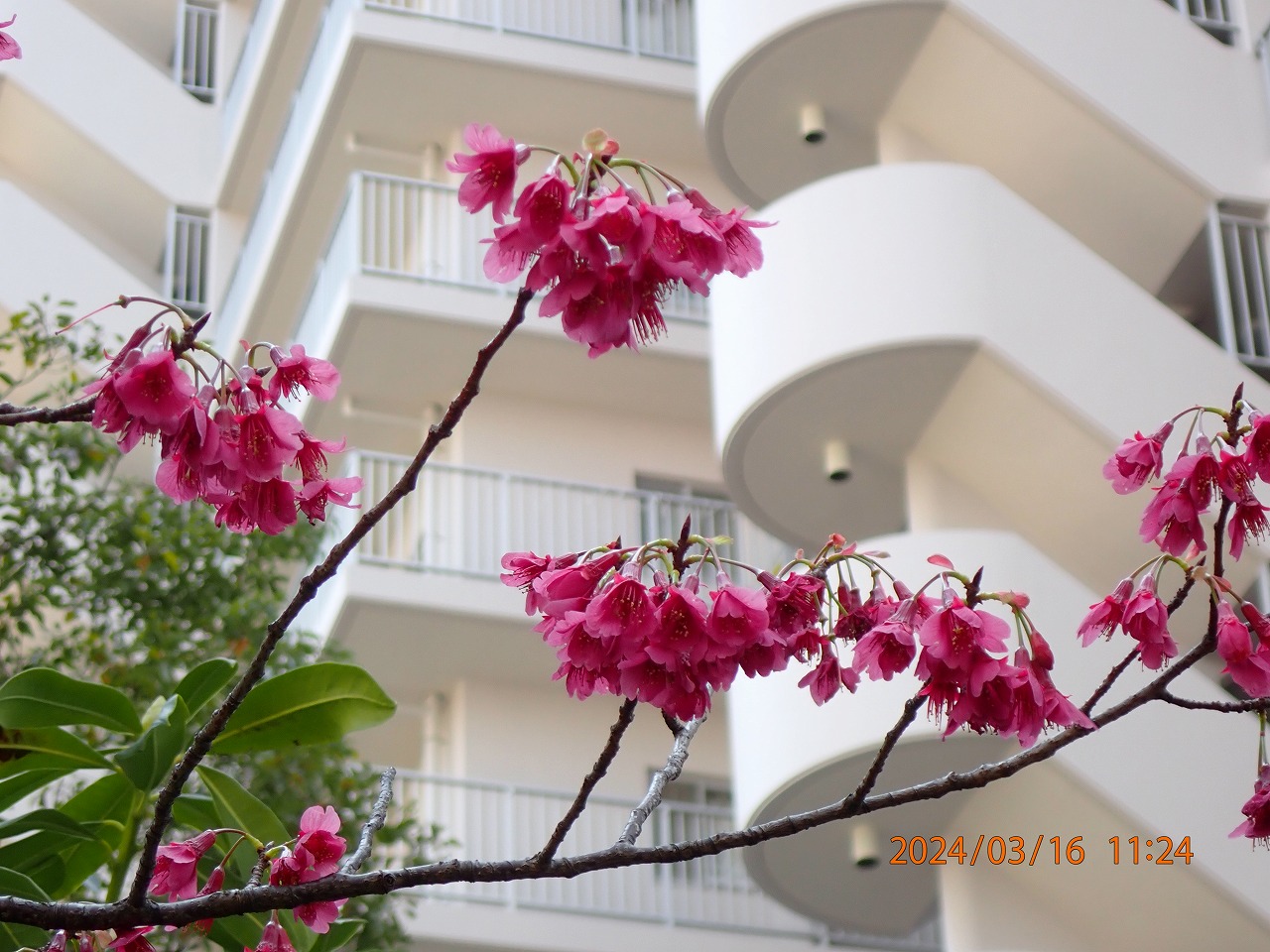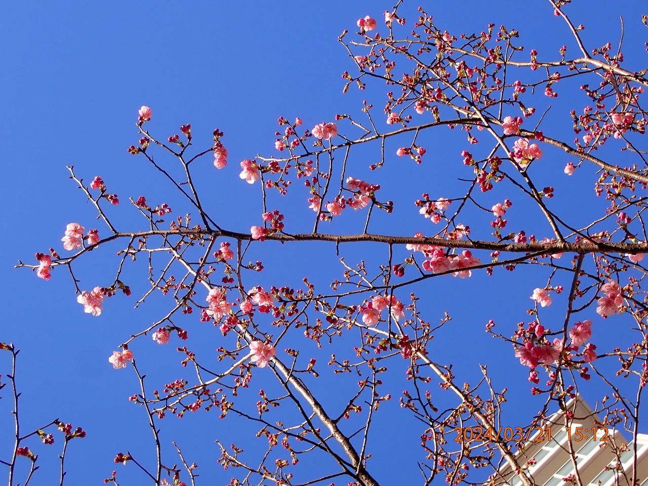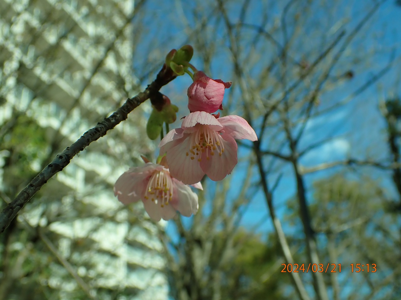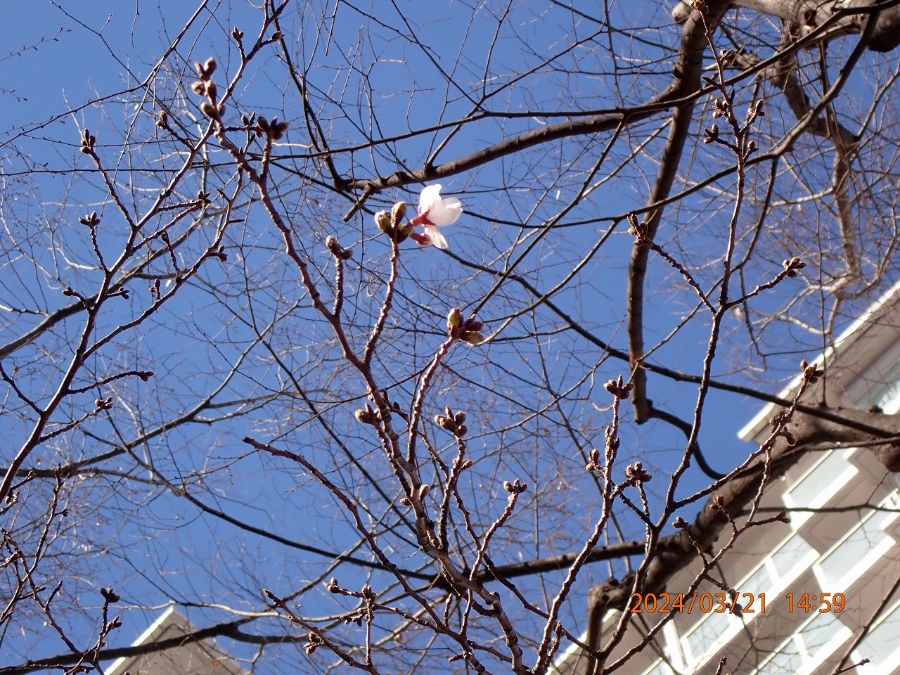 蕾が大きくなってきた。そんな中、高い梢に1輪だけ咲いているのを見つけた。もう2-3日で開花宣言ができるか。