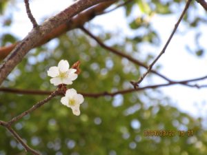 蕾が大きくなってきた。そんな中、高い梢に1輪だけ咲いているのを見つけた。もう2-3日で開花宣言ができるか。