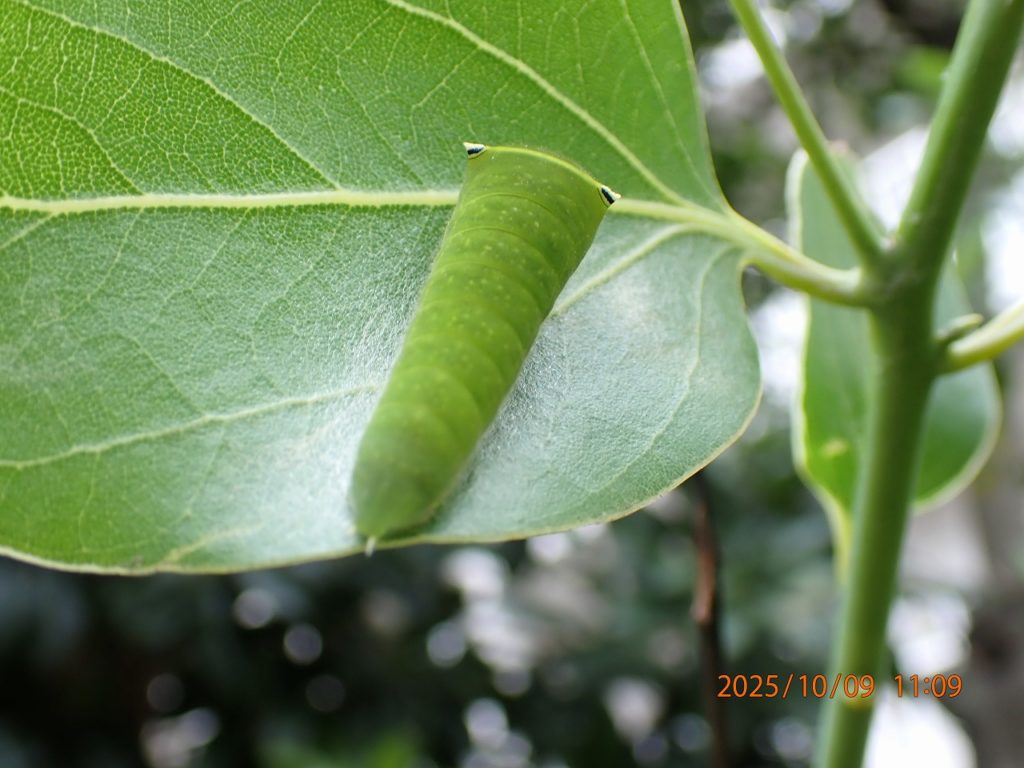 ヤブニッケイはクスノキ科の植物で、アオスジアゲハの植樹です。毎年、何回もアオスジアゲハが産卵しています。高いところはしたからではなかなかよく見えませんが、ひこばえにはこのように幼虫が育っています。最後の写真は羽化したばかりのアオスジアゲハです。